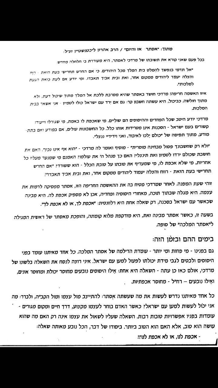 הקטע בכתב:מתוך ''אסתר - אז והיום'' / הרב אהרון ליכטנשטיין זצ"לבכל פעם שאני קורא את תשובתו של מרדכי לאסתר, היא מעוררת בי חלחלה מחדש: