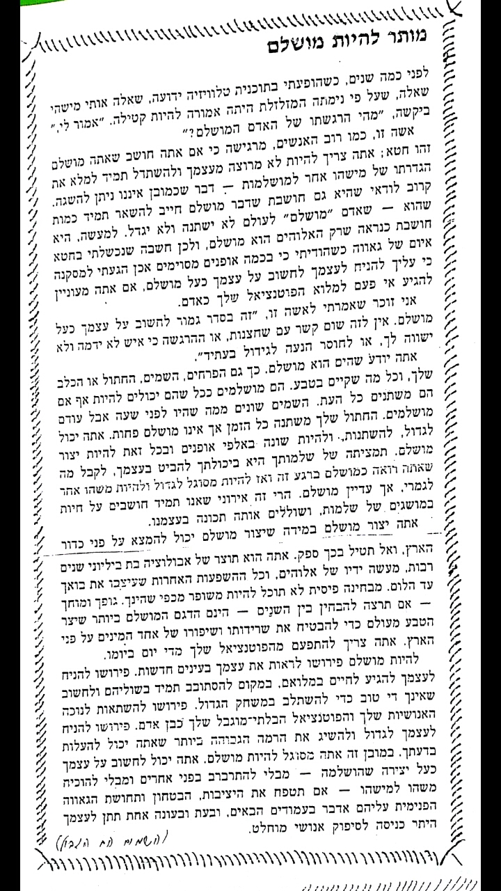 ההבנה שכן, אנחנו מושלמים, הקב''ה ברא אותנו בצורה מושלמת, וגם הנפילות הן לתועלת.