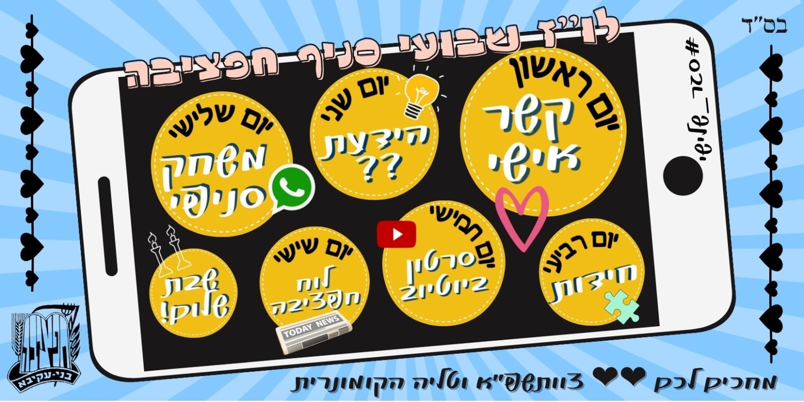 •8• עיתון ווירטואלי- לקראת שבת שולחים עיתון בקובץ PDF עם דברי תורה, משחקים, פינות מיוחדות, ד''שים מהמדריכים וכו'.