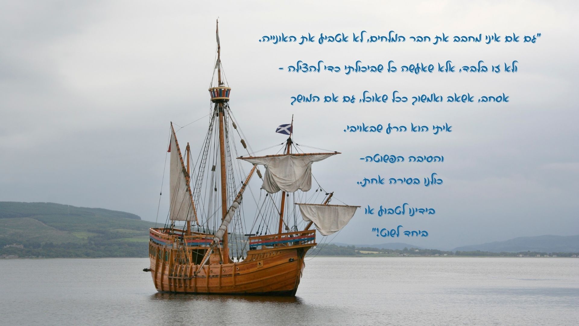 - גם אם איני מחבב את חבר המלחים, לא אטביע את האונייה. ולא זו בלבד, אלא שאעשה כל שביכולתי כדי להצילה - אסחב, אשאב ואמשוך ככל שאוכל, גם אם המושך איתי הוא הרע שבאויבי. והסיבה הפשוטה- כולנו בסירה אחת.. בידינו לטבוע או בי.jpg (203.63 KiB) נצפה 3831 פעמים לחצו להורדה