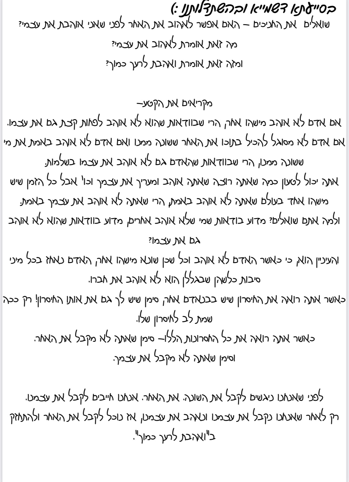 על הפעולה - היא קצרה יחסית, מדברת על כך שלפני שבאים ומנסים לאהוב את האחר - קודם צריך לדעת לאהוב ולקבל את עצמנו! זה השורש ל״ואהבת לרעך כמוך״ ובלי זה לא יוכל לקיים את המצווה בשלמותה!