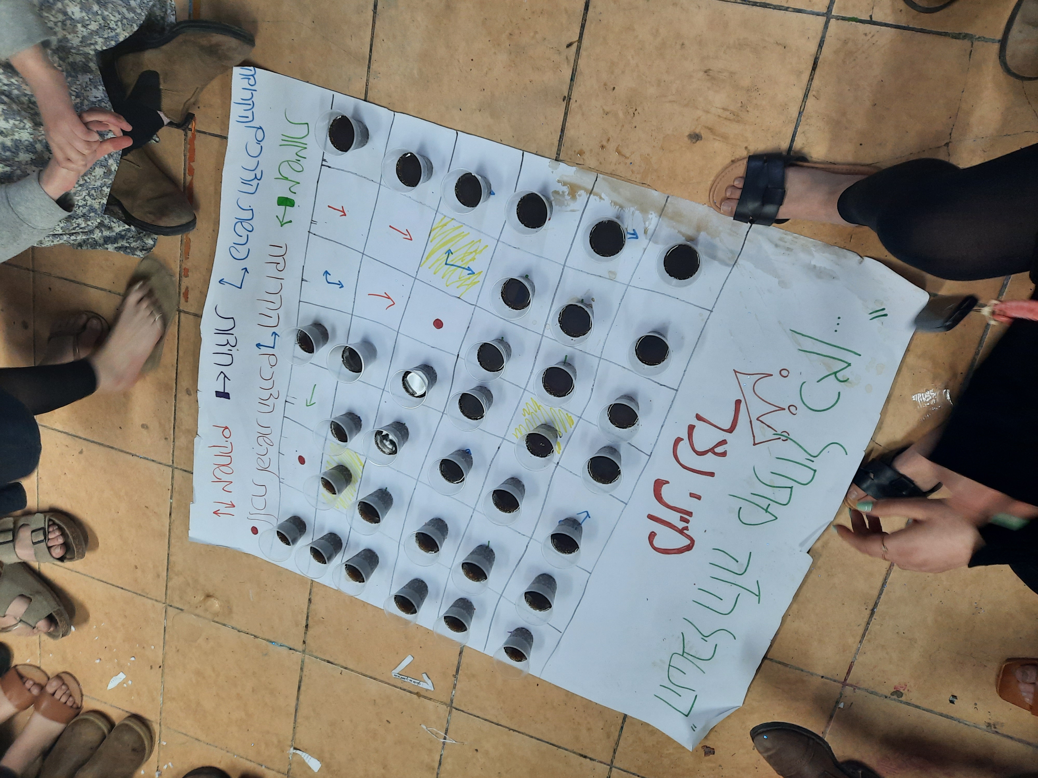 *משחק הכוסות-מכינים מראש טבלה ומציירים חצים בצבעים שונים. על אחת המשבצות די באמצע כותבים סוף.