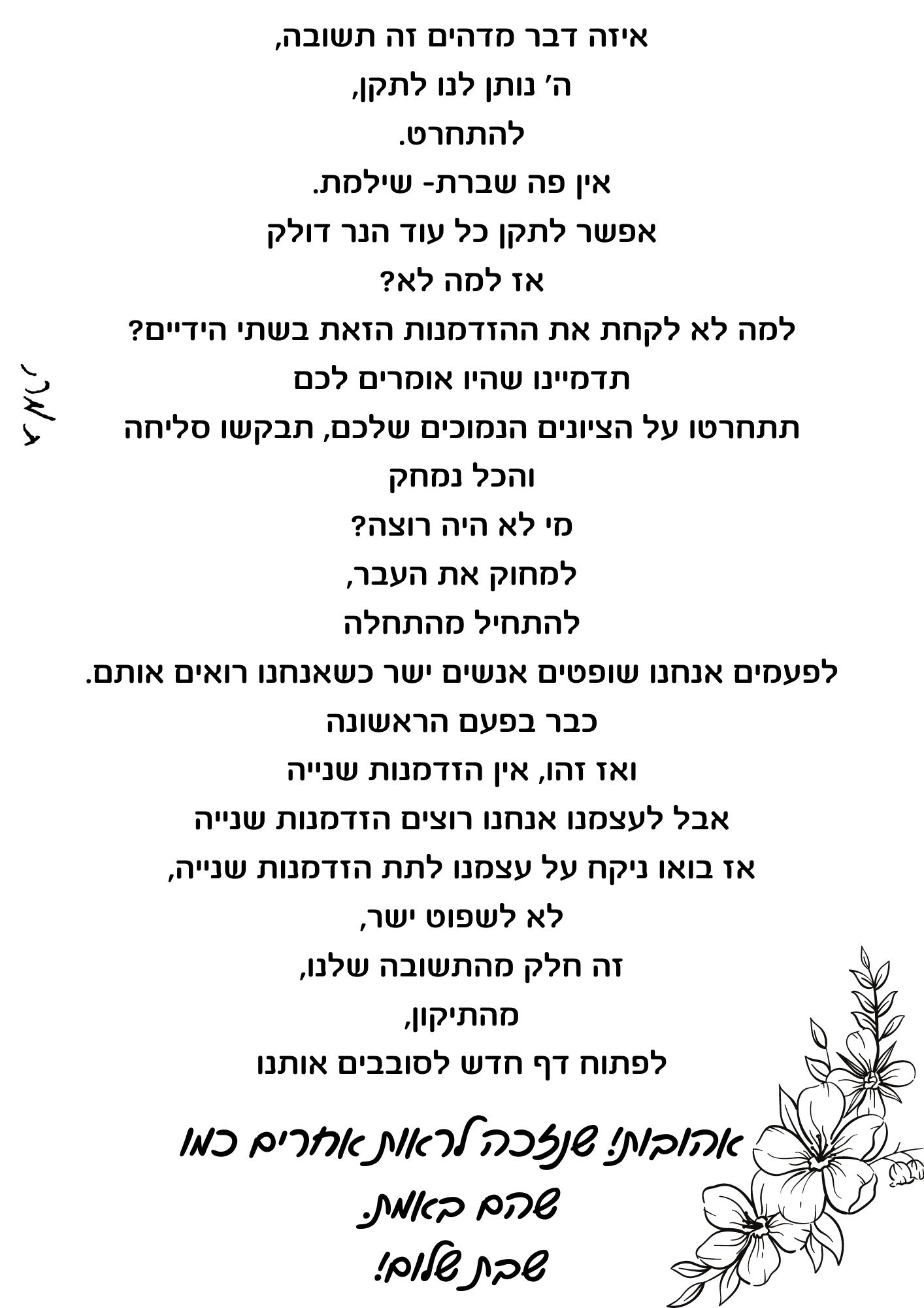 - איזה דבר מדהים זה תשובה, ה' נותן לנו לתקן, להתחרט. אין פה שברת- שילמת. אפשר לתקן כל עוד הנר דולק אז למה לא למה לא לקחת את ההזדמנות הזאת בשתי הידיים תדמיינו שהיו אומרים לכם תתחרטו על הציונים הנמוכים שלכם, תבקשו סליחה.jpg (247.35 KiB) נצפה 3864 פעמים לחצו להורדה