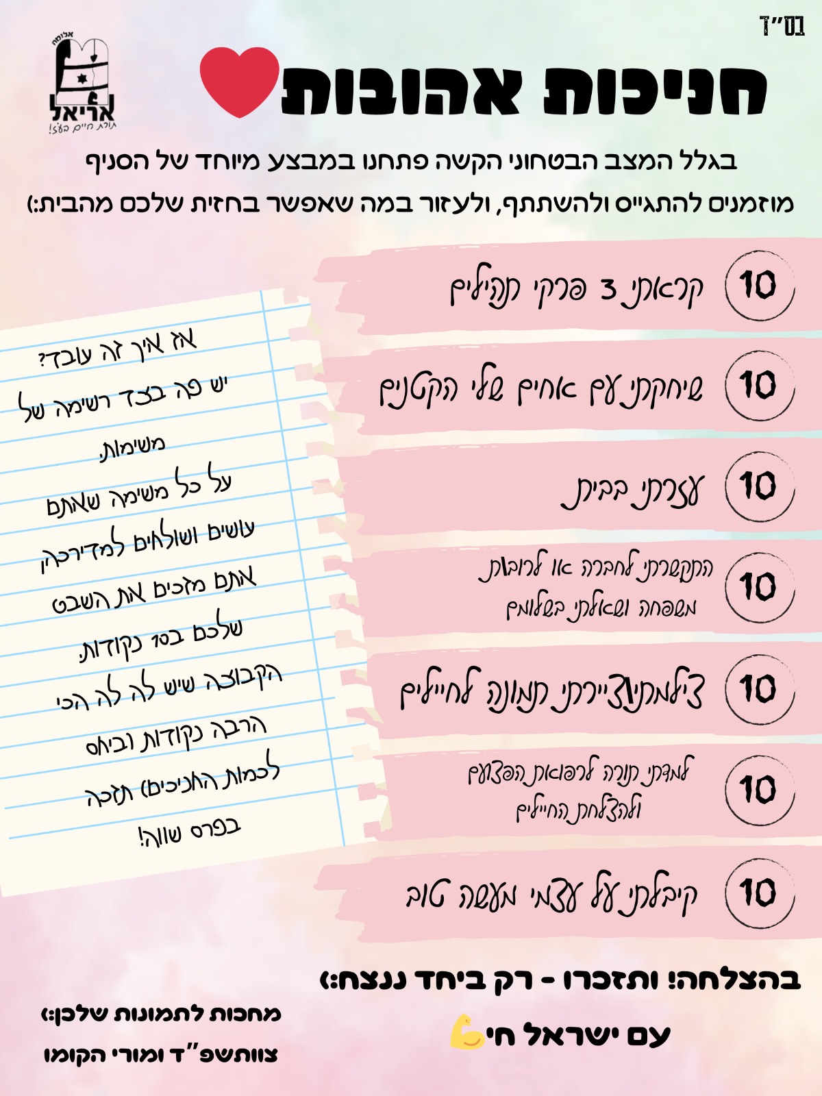 החניכים יקבלו רשימה של משימות שאפשר לעשות בבית (לדוג: לקרוא 3 פרקי תהלים, לעזור בבית, להכין מכתב לחיילים וכו')
