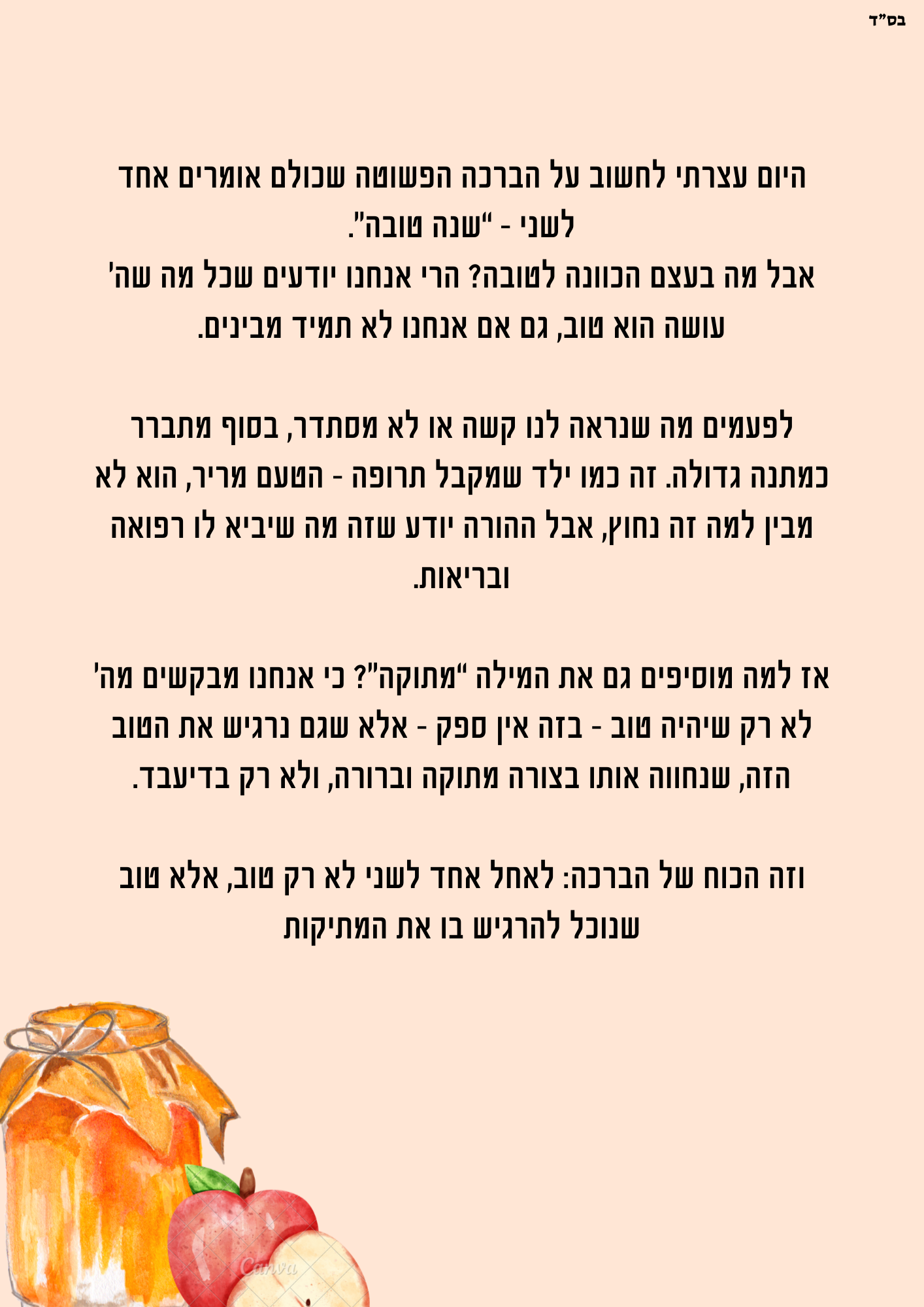 היום עצרתי לחשוב על הברכה הפשוטה שכולם אומרים אחד לשני – “שנה טובה”. אבל מה בעצם הכוונה לטובה? הרי אנחנו יודעים שכל מה שה׳ עושה הוא טוב, גם אם אנחנו לא תמיד מבינים. לפעמים מה שנראה לנו קשה או לא מסתדר, בסוף מתברר כמתנה גדולה. זה כמו ילד שמקבל תרופה – הטעם מריר, הוא לא מבין למה זה נחוץ, אבל ההורה יודע שזה מה שיביא לו רפואה ובריאות. אז למה מוסיפים גם את המילה “מתוקה”? כי אנחנו מבקשים מה׳ לא רק שיהיה טוב – בזה אין ספק – אלא שגם נרגיש את הטוב הזה, שנחווה אותו בצורה מתוקה וברורה, ולא רק בדיעבד. וזה הכוח של הברכה: לאחל אחד לשני לא רק טוב, אלא טוב שנוכל להרגיש בו את המתיקות.